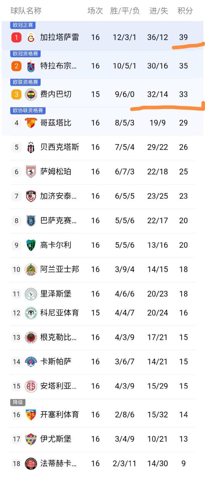 今天凌晨,土超第16轮结束多场争夺,土超积分榜也得到更新,球队积分排名情况有变化,我们来看看。
